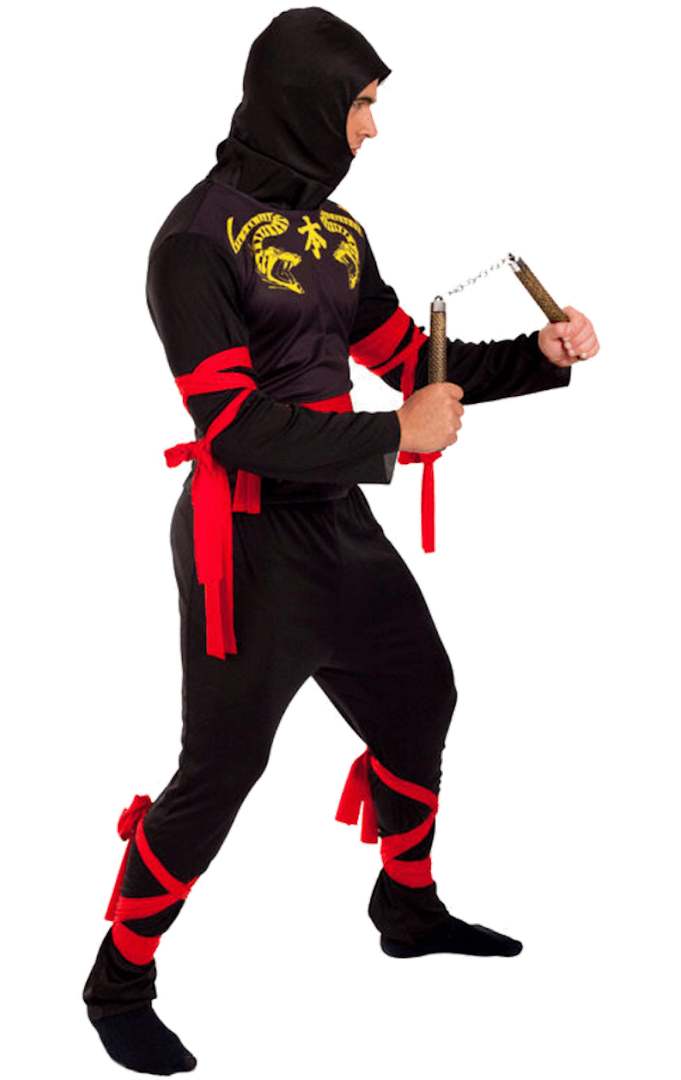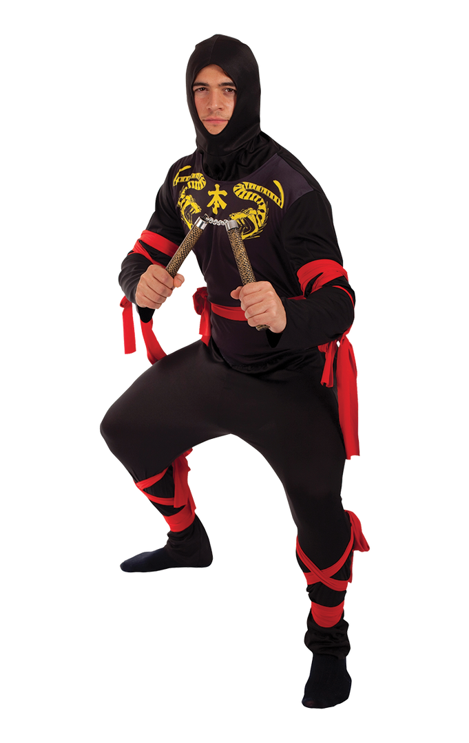 The Adult Dragon Ninja Costume is made up of a black top with matching trousers. It features red rope detailing around the legs, waist and arms, as well as intricate yellow illustrations of dragons printed on the upper chest. The costume also includes a black hooded headpiece to complete your ninja look.