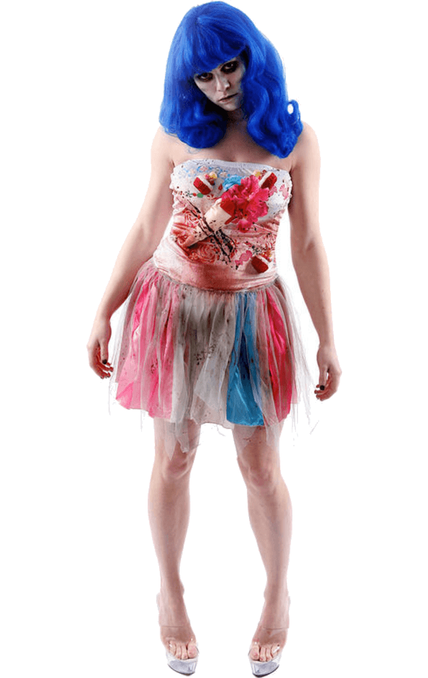 There is nothing sweeter than the sound of blood dripping on Halloween night. Our Candy Girl Zombie Costume is perfectly terrifying, so much so, I doubt anyone will be coming to you for treats. Product includes extremely bloody candy girl bodice and skirt. Buy an electric blue wig for the full look!
