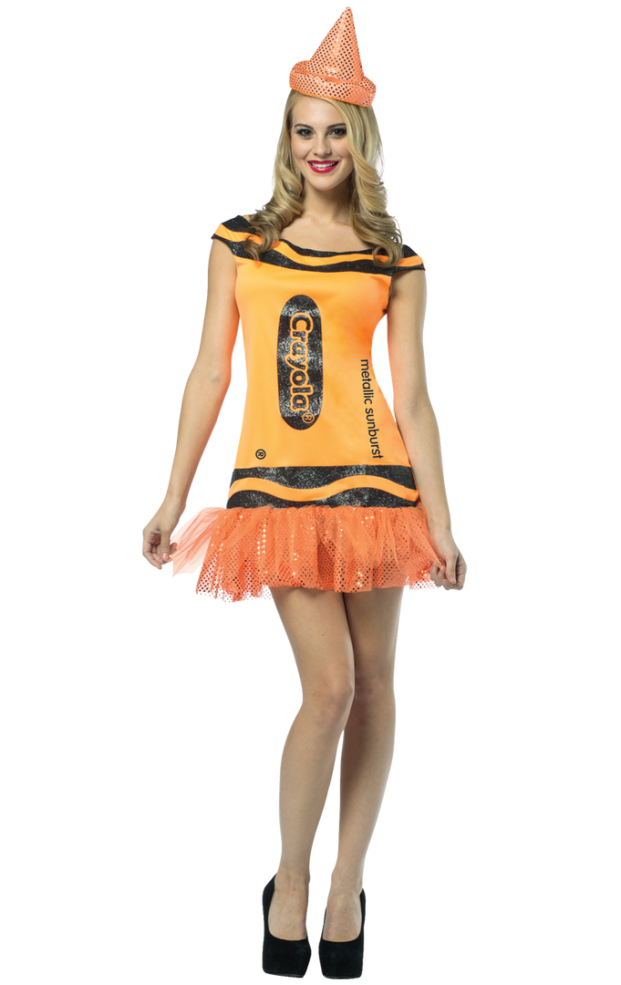 The Ladies Sunburst Orange Crayola Crayon Costume includes a orange dress with crayon logo printed in black and a sparkly net Tutu style skirt attached. Hat is also included. This is a one size item designed to between a size 6-12.