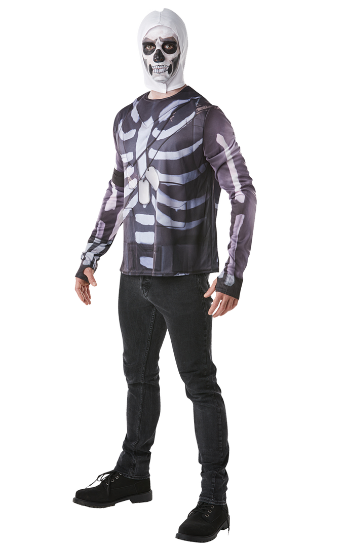 Hop into the Battle Bus and get prepared for some Battle Royale carnage with our Adult Fortnite Skull Trooper Costume! The Skull Trooper skeleton design is ideal for Halloween or anyone that’s a big fan of the hit video game. Sneak your way into the buildings with the best loot, stock up on ammunition, chug jugs and let the party commence! Costume comes with printed shirt with armband and white skeleton style snood.