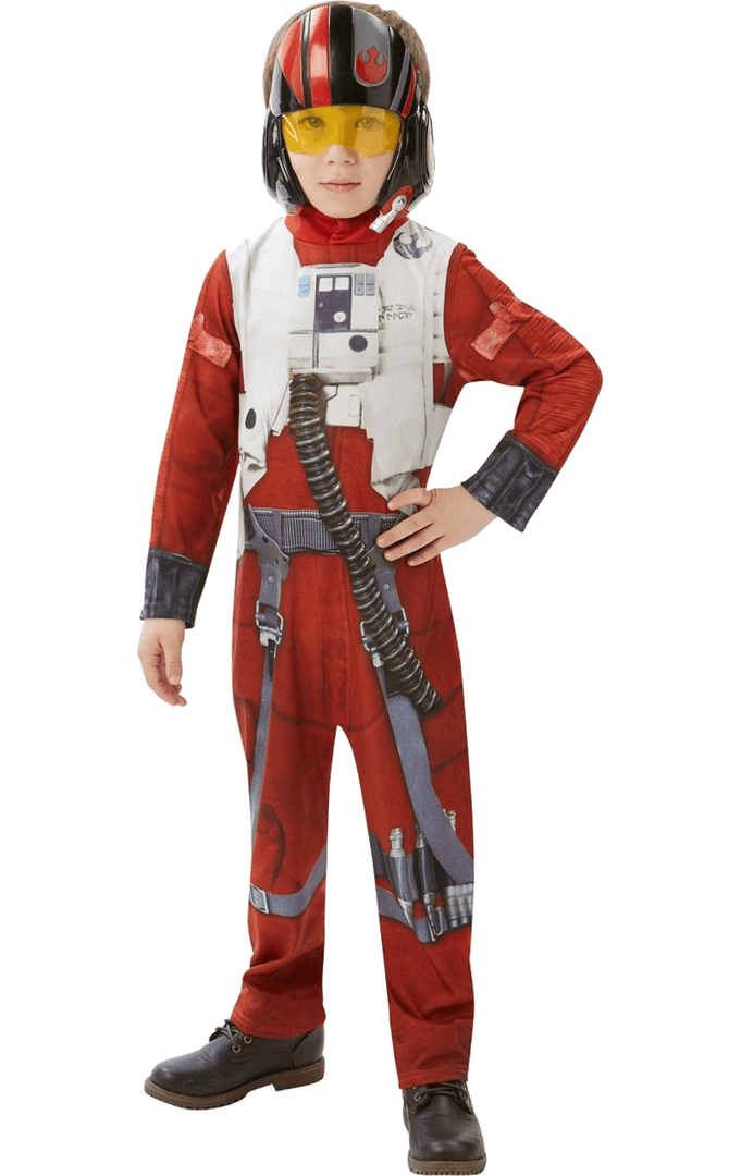 This Kids Star Wars X Wing Pilot Costume includes an all-in-one red jumpsuit with intricate detailing throughout. Also included is a matching mask with an attached pair of translucent orange glasses.