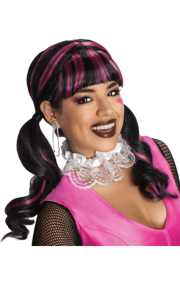Complete your Draculaura look in our Draculaura Monster High Wig. Comes complete with pretty black and pink pig tails and fringe.