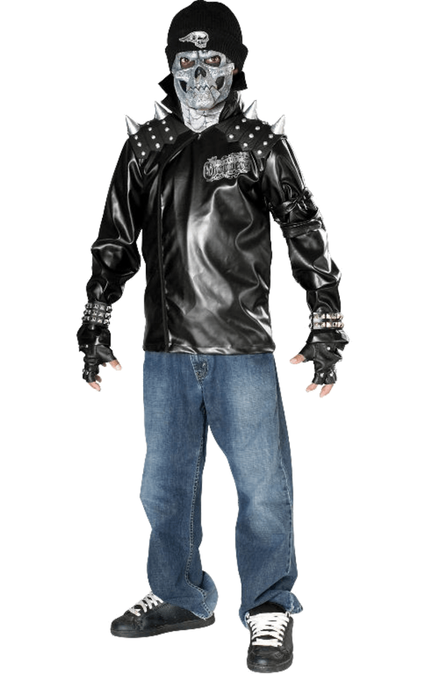 Turn up to the Halloween party revving your engine, everyone will turn to look at the coolest ghoul who has just arrived! Your child will love the Kids Death Skull Biker Costume for trick-or-treating. It features a metal look skull facepiece with an attached beanie hat, as well as a leather look studded biker jacket and fingerless gloves. Your little one is sure to collect all of the best sweets when out on Halloween when wearing this rocking outfit!