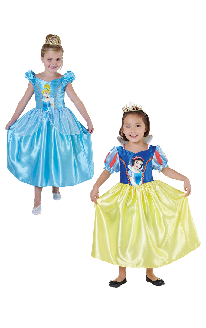 Snow White to Cinderella Reverse costume includes one dress with two Disney princess designs. One side of the dress is blue with a Cinderella print, turn it inside out and the dress is yellow and blue with snow white print on the other side. Also included is a tiara. Other accessories are available separately.