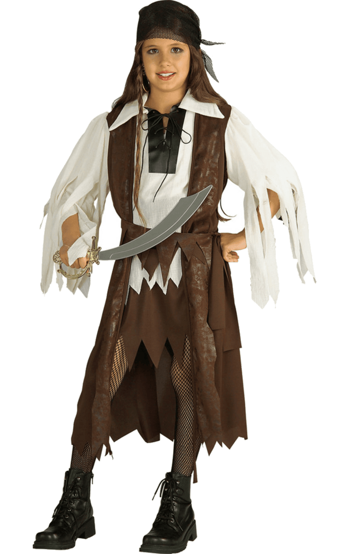 Arggg! Yer little one will be sailing the seven sea’s in no time once slipping on the Kids Pirate Queen Costume. Ideal for World Book Day or Movie fancy dress parties, this pirate costume for girls features a white dress with attached brown tattered waistcoat and a lace up shirt front. This scruffy look comes complete with a brown bandana headscarf.