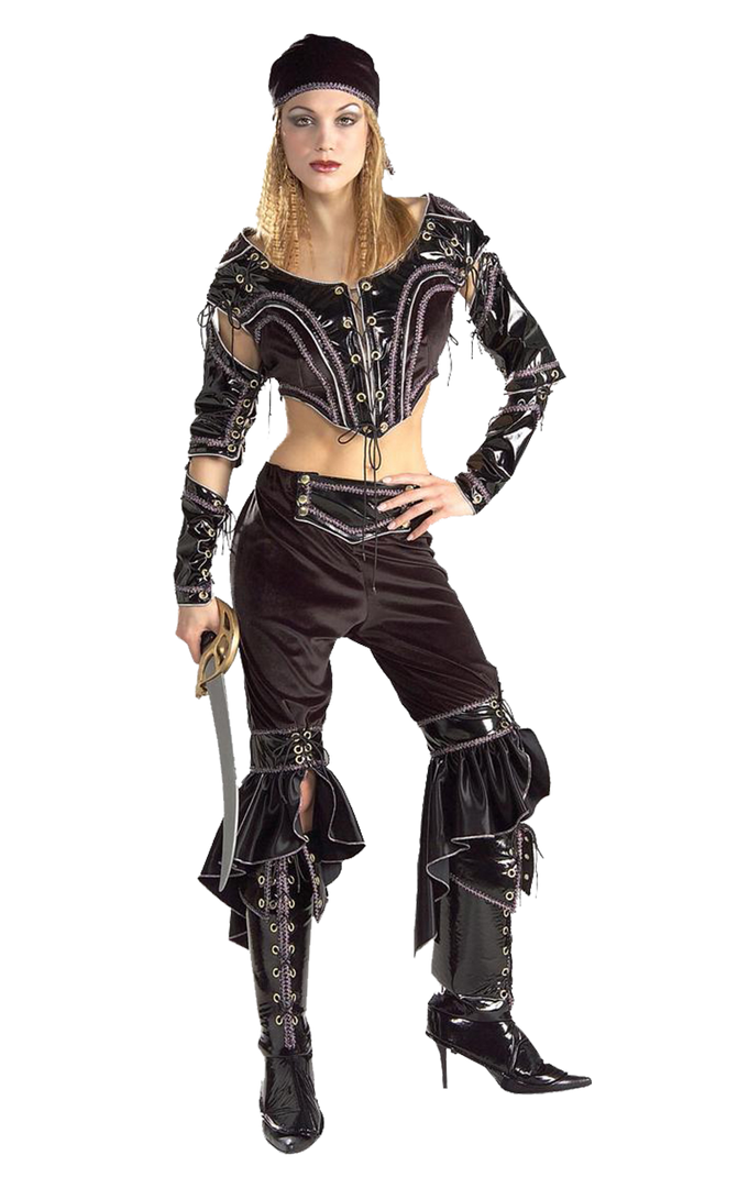 Our Ladies Buccaneer Costume comes complete with a long-sleeved crop top that’s made of a PVC type material. It has tie detailing throughout the costume, making it incredibly unique. Also included are a pair of matching trousers that are of a similar style. Finally, to ramp up your accessory game, it comes with a pair of black boot covers and a black headpiece with gold rim detailing.