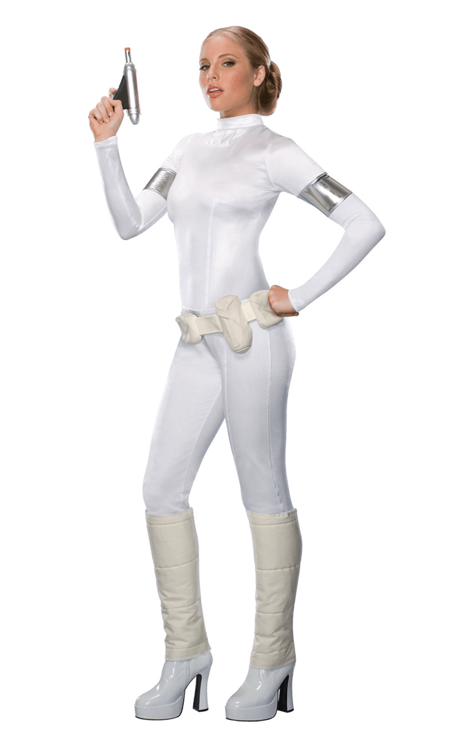 This Padme Amidala costume includes a high necked jumpsuit and attached padded boot tops. Also included is a silver armband, a rubber utility belt that fastens with velcro and a blaster. Materials listed as 88% polyester 12% spandex. Boot top lining 100% polyurethane. This is an officially licensed product. Star Wars and Padme Amidala are copyright and trademarked of Lucasfilm. All Rights reserved
