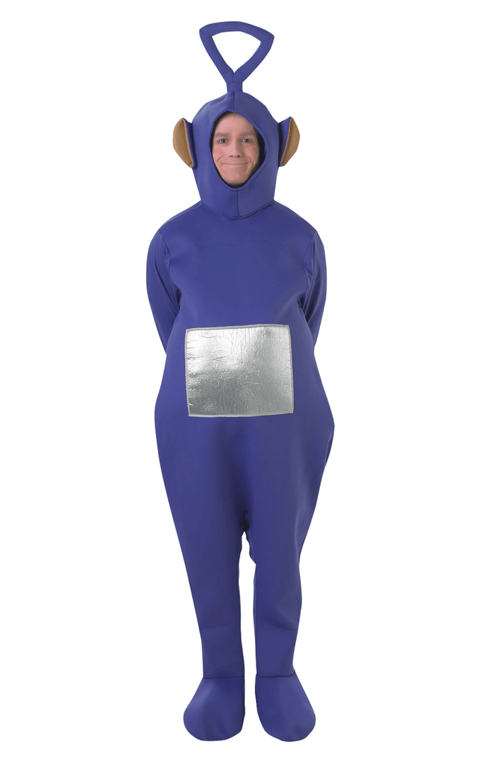 Our Adult Teletubbies Tinky Winky Costume consists of an all-in-one dark purple bodysuit that includes a silver square printed on the front to act as the Teletubby TV. Also included is a detachable headpiece with ears and antenna.