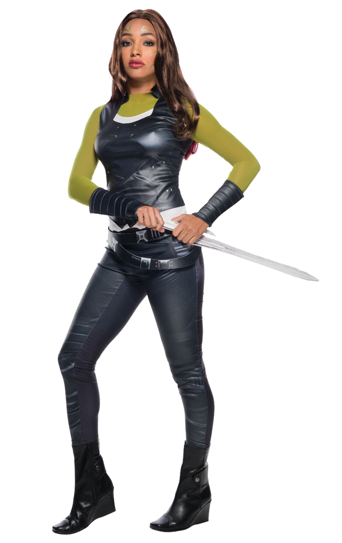 The Women’s Guardian of the Galaxy Gamora Costume is made up of a fitted, leather-look black bodice, with attached green sleeves and a pair of matching leather-look leggings. Completing the outfit is a pair of black gauntlets and a belt that’s printed with space-faring detailing. Add a little bit of green face paint and you have everything you need to look just like Gamora.
