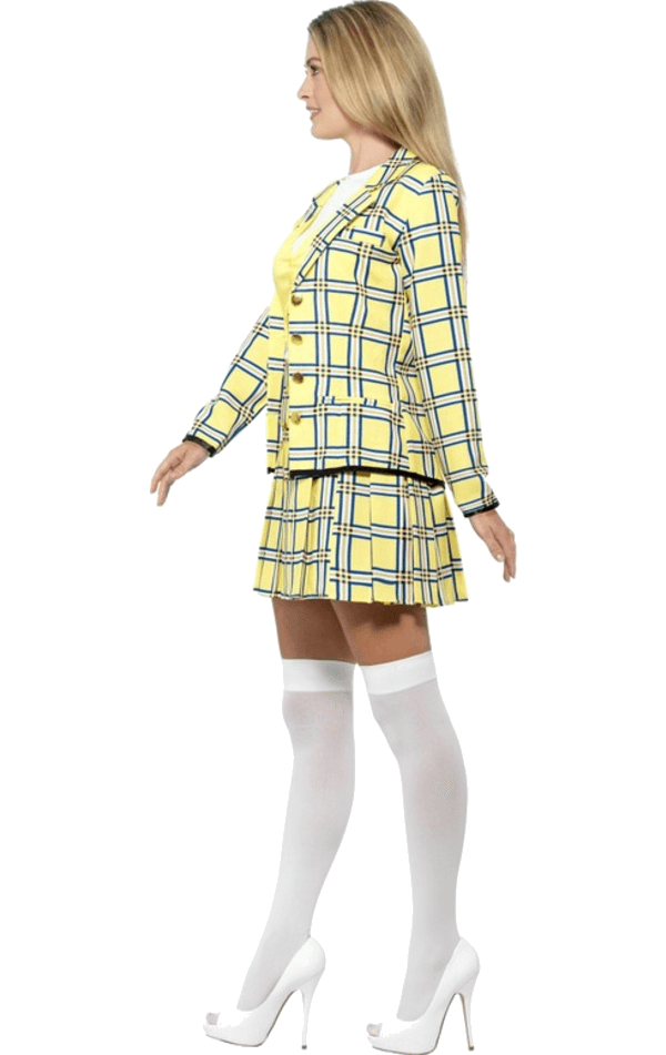 Keep it real with this classic Cher costume inspired by the hit 90s film Clueless. This outfit includes a yellow tartan print jacket, matching skirt, white top with attached mini waistcoat and knee high stockings.