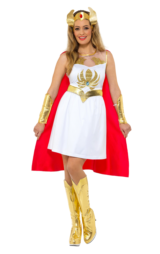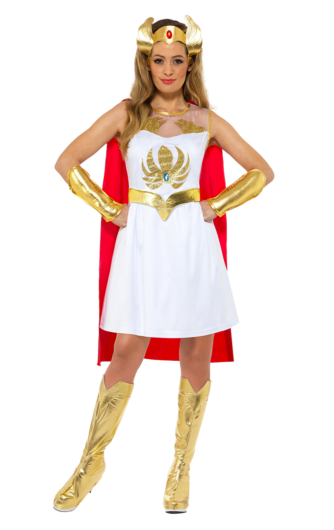The Adult She-Ra Costume is based on the famous look from original television series. It’s made up of her magnificent white dress with a shimmering gold She-Ra emblem on the chest, with blue jewel to finish. The costume also features a red cape, golden arm cuffs, boot covers, and an incredible golden headpiece with a red jewel in the centre. It’s a serious but glamourous superhero costume that can be used for any occasion.
