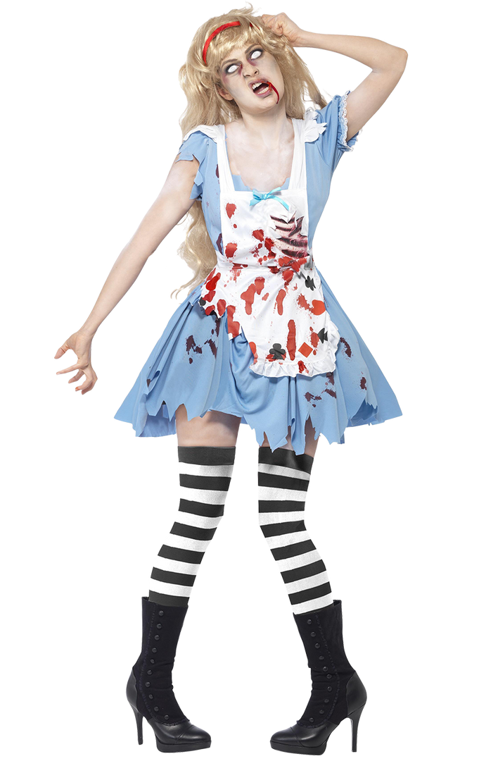 The Adult Zombie Alice Costume features a blue knee-length dress that has a ragged sleeves and hem to make it look like she’s had a tough night. Also included is a white apron with blood stains dotted all over. To finish off the look, the outfit comes with a red headband. If you want to take your possessed Alice look to the next level, then pop on some white face paint, practice that zombie walk and splash over more fake blood!