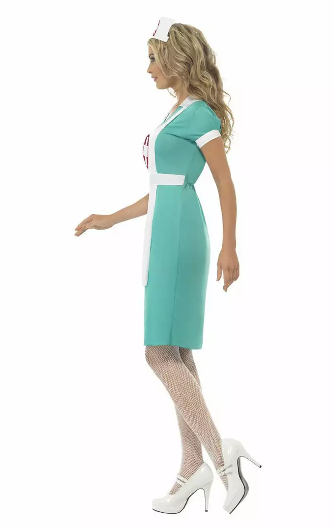This knee-length nurse outfit is more modest than the usual naughty nurse costume variety! Preserve your dignity as you check patient’s pulses and embrace your inner Florence Nightingale. Featuring a turquoise scrubs coloured dress with attached apron and matching hat with red cross, you’re sure to get hearts racing in this figure hugging number!