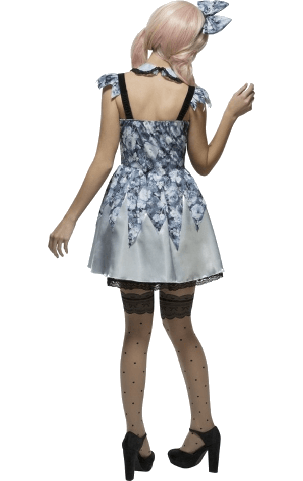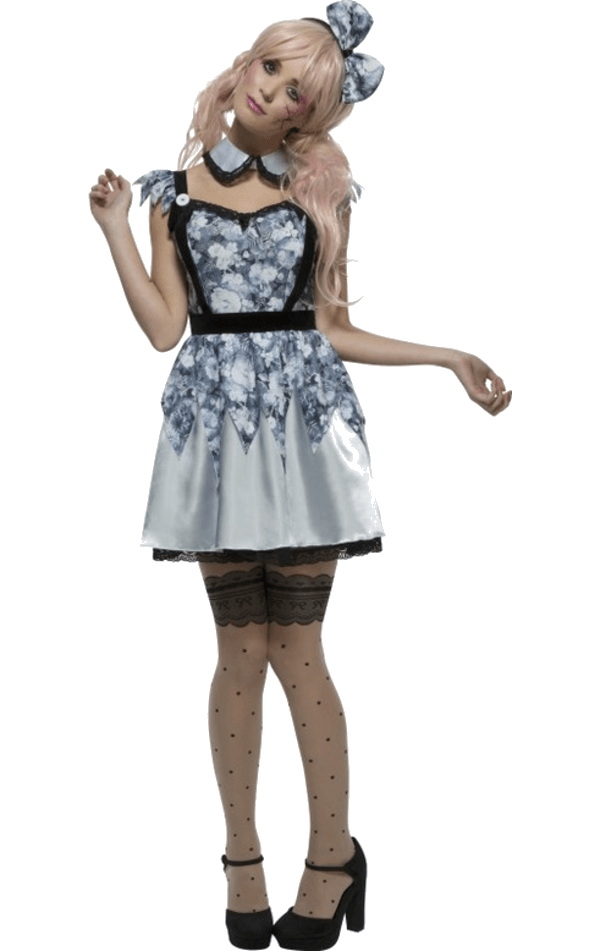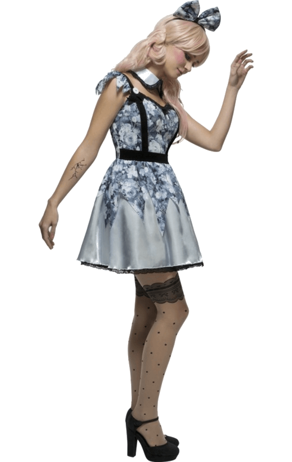 Don’t let anybody put you in the corner this Halloween in our Fever Broken Doll Costume. This saucy ensemble is both creepy and sexy, as all Fever costumes are. A pretty grey, floral dress that looks somewhat ghostly due to the dark shades. Product includes short floral dress, neck collar and bow headband. To really make it stand out, add some broken doll make up which you can find in our accessories section!
