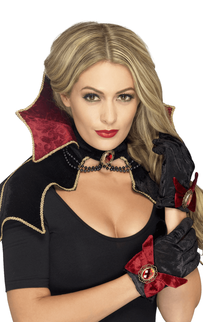 If you’re not into blood and gore, you can go as a Vampire! They’re known for being seductive, sultry and hungry! Sink your fangs into the Female Vampire Kit. It includes soft black gloves, a stiff collar with a jewel choker and an attached cropped cape. Pair with a sultry black dress and blood red lips for the complete classic Halloween vampy look, or add onto a vampiress fancy dress costume for the ultimate trick-or-treat ready look.
