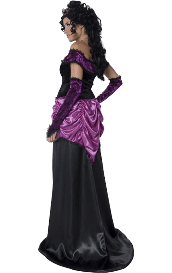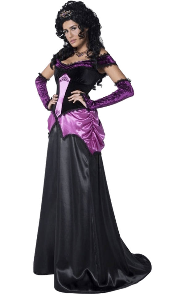 In Romania, the mythical Strigoi do hold residence. A vampiric breed of blood-thirsty immortals. Our Countess Nocturna Vampire Costume could well be the outfit of a Strigoi countess! Listen to the whispers of the night in this lustrous black and purple ensemble with sumptuous satin. Product includes elegant full-length dress and elbow length satin gloves.