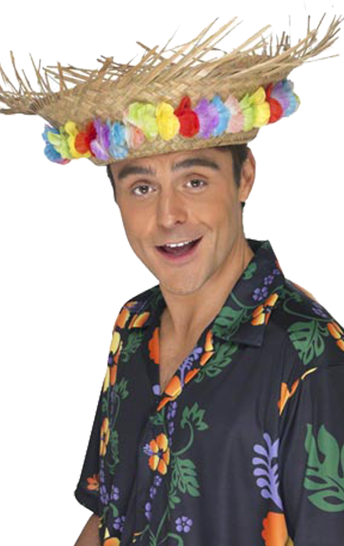 Aloah, this is the perfect hat for a Luau, woven out of straw the unfinished ends stick out all around the brim. The hat is finished off with leis style flowers.