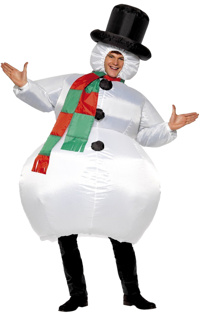 The Inflatable Snowman Costume is made up of an inflatable snowman body with a fan inside to inflate the costume and keep it standing upright. It also has a cut out for the face, a striped scarf and an attached black top hat to complete the look. Nobody will miss you arriving at the party; you’ll be centre of attention as you enter the room in Christmas style.