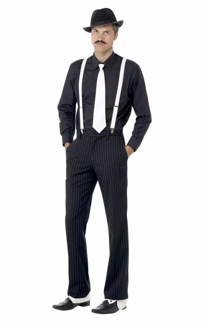 Add some instant razzle dazzle to your 1920s outfit by dropping yourself straight back to the era of gangsters, molls and speakeasies! This Instant 1920s Gangster Set will set you up to the roaring decade and keep you looking sleek, ship and sharp with the white braces, tie, hat, moustache and white spats.