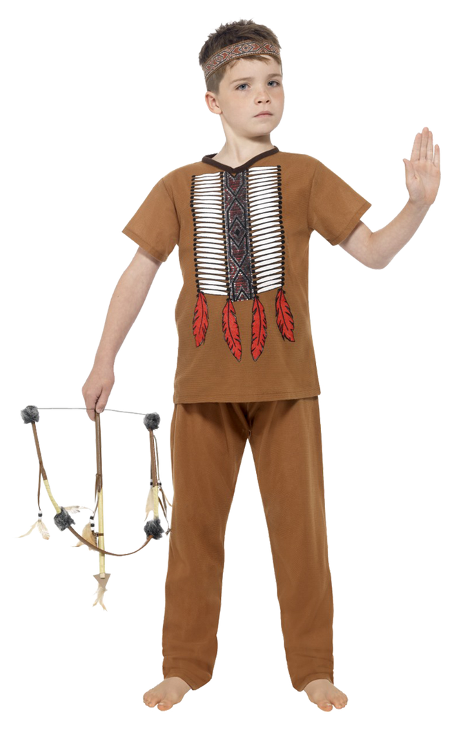 This Kids Native Indian Warrior Costume includes a brown tunic top with feather print pattern, brown trousers, and a patterned headband. It’s great as a kids book character dress up option or as a World Book Day costume for school.