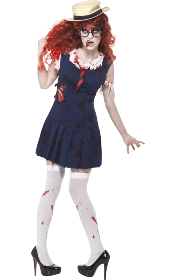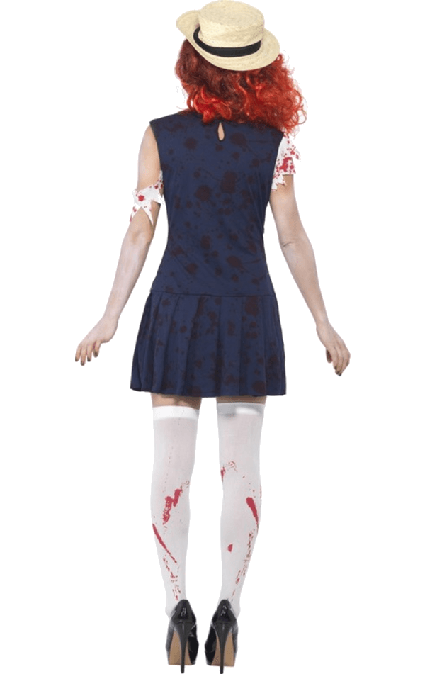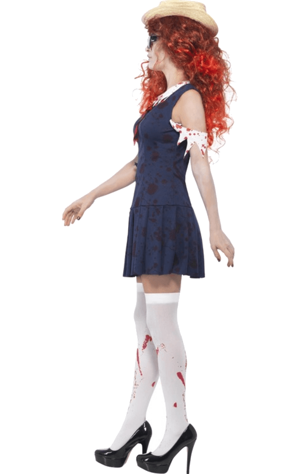Spice up school in our Ladies Student Zombie Costume. Teach your teacher a thing or two about brain eating this Halloween. The playground has never seemed so terrifying! Product comes with blue, exposed rib, blood stained dress and straw hat.