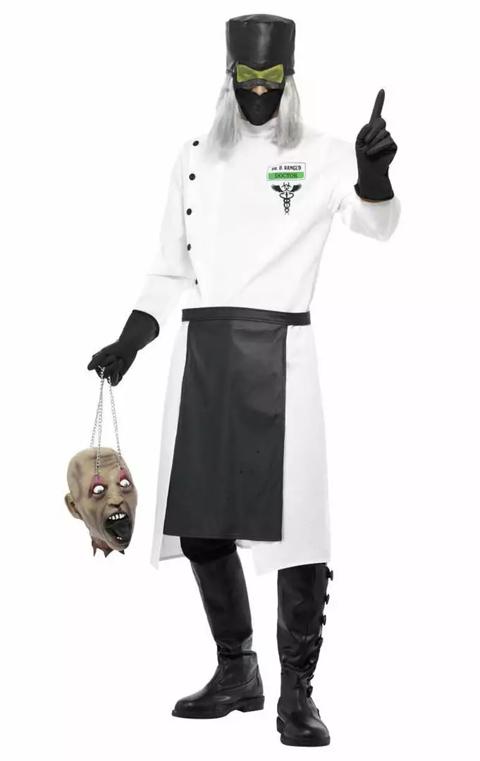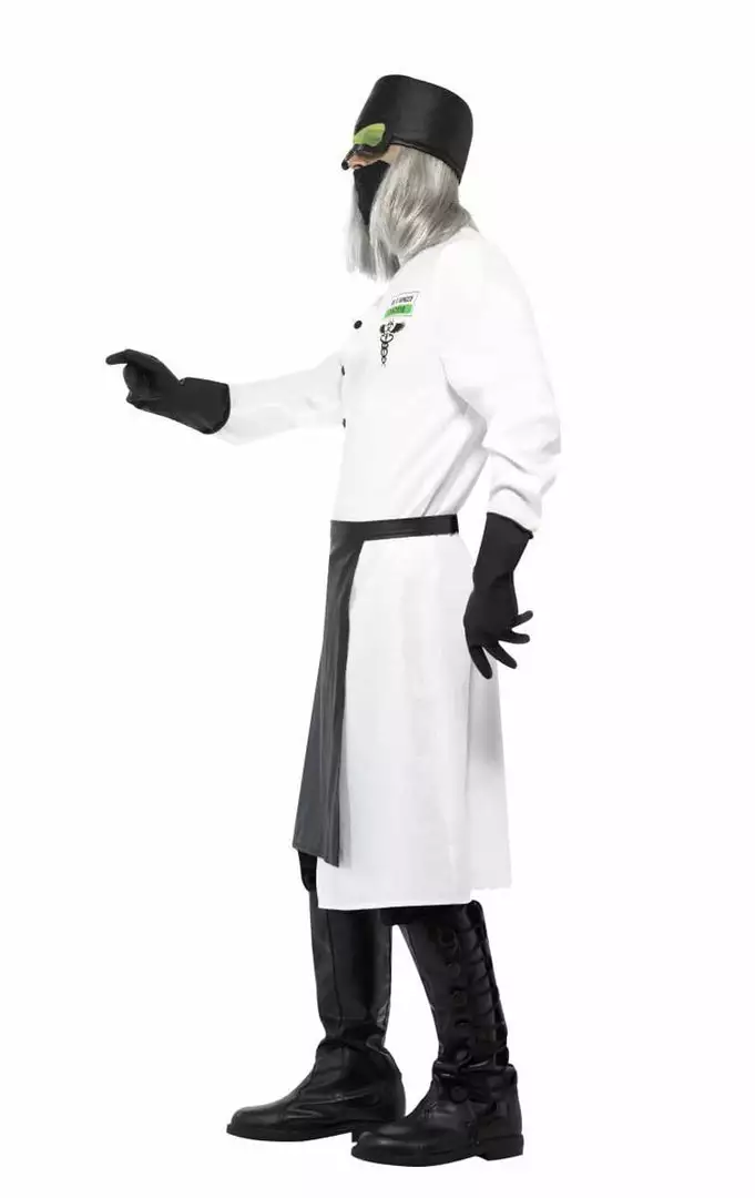 Act out all those horror film classics in this Mens Evil Scientist D Ranged Costume, complete with a long white doctors coat, black apron, gloves, hat with faux hat, a face facepiece and mesh eye panels.