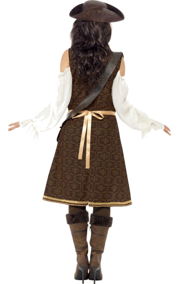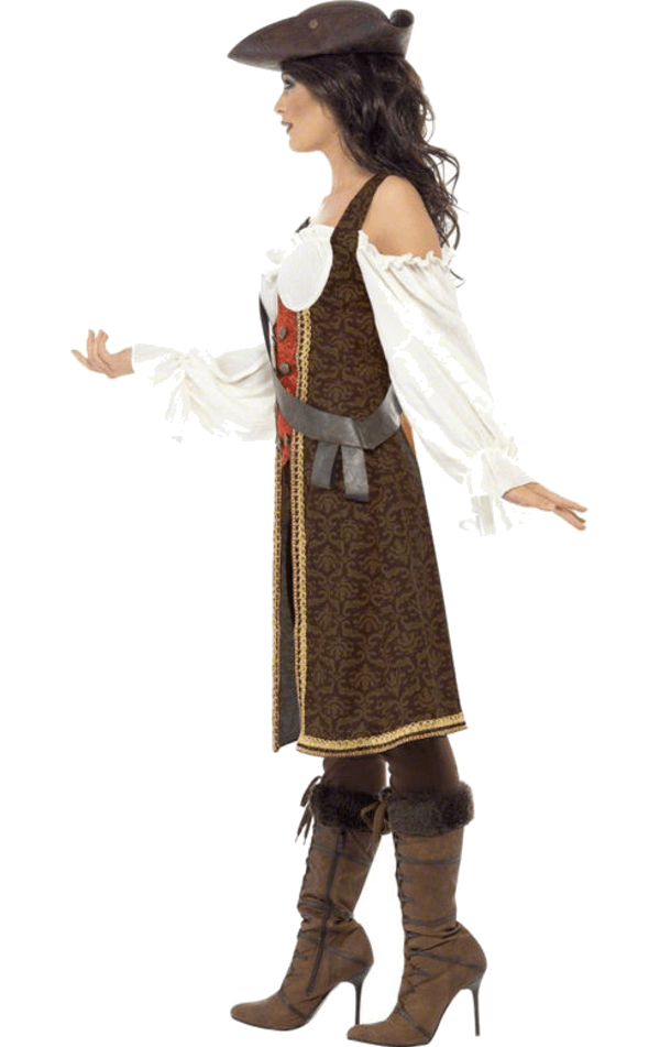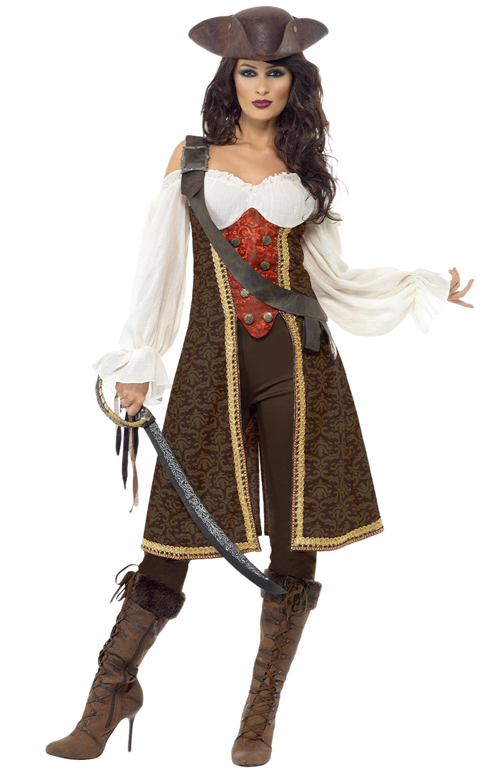 Act like a swashbuckling Caribbean Angelica in this stunning High Seas Pirate Wench costume. Forget short pirate skirts, this Captain wears the trousers on her ship. Featuring long brocade patterned coat with attached white pirate shirt and waistcoat and cropped trousers, this is a feisty pirate lady outfit like no other. Team up with your High Seas Mate for the ultimate buccaneer his n hers duo.
