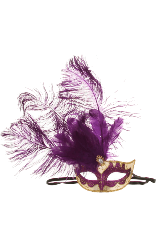 Float around a Venice ballroom with our Purple Venetian Masquerade Facepiece. Mystery will shroud you as the facepiece hides your identity – perfect for a facepieceed ball, this gold and purple glittered facepiece will really stand out from the crowds. With large feathers coming out of one side, you’ll be sure to be noticed!