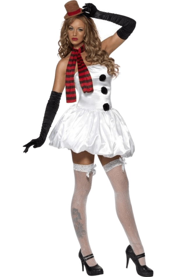 The Sexy Snow Woman Costume is made up of an elegant strap-less white dress with puffed skirt, and three black pom poms down the centre for the ‘buttons’. The outfit also includes a striped red and brown scarf with matching mini top hat on a headband, giving it a stylish twist.