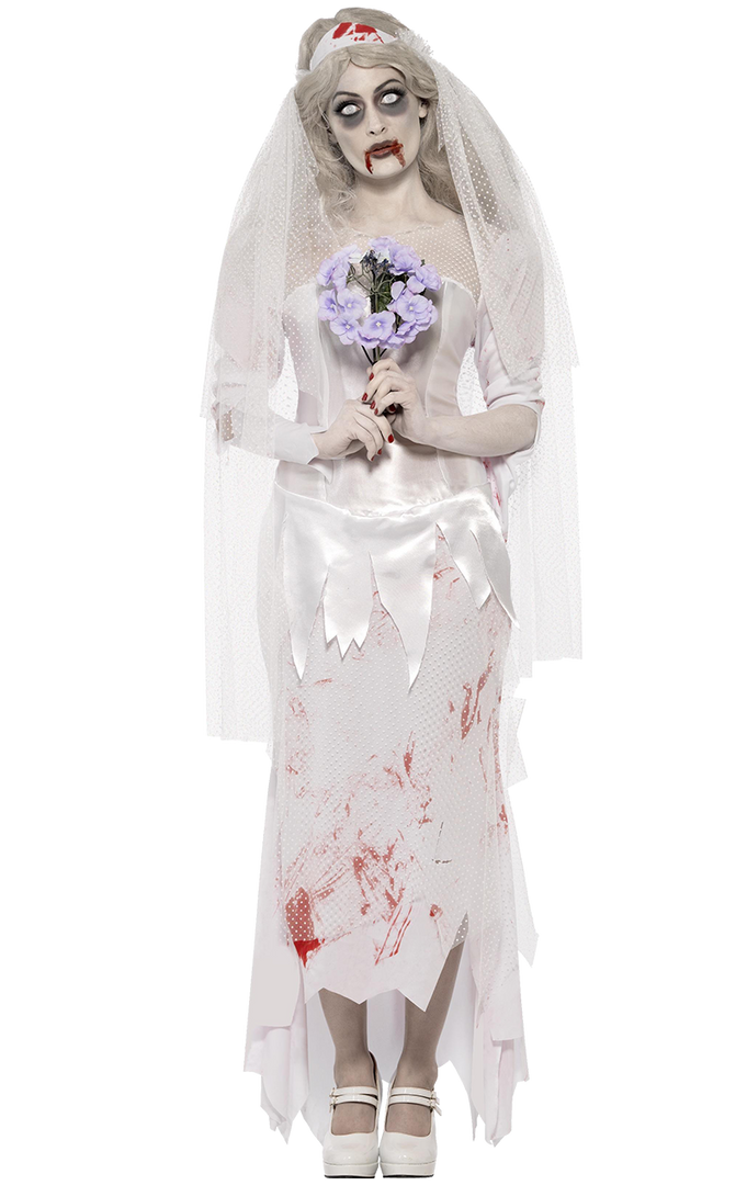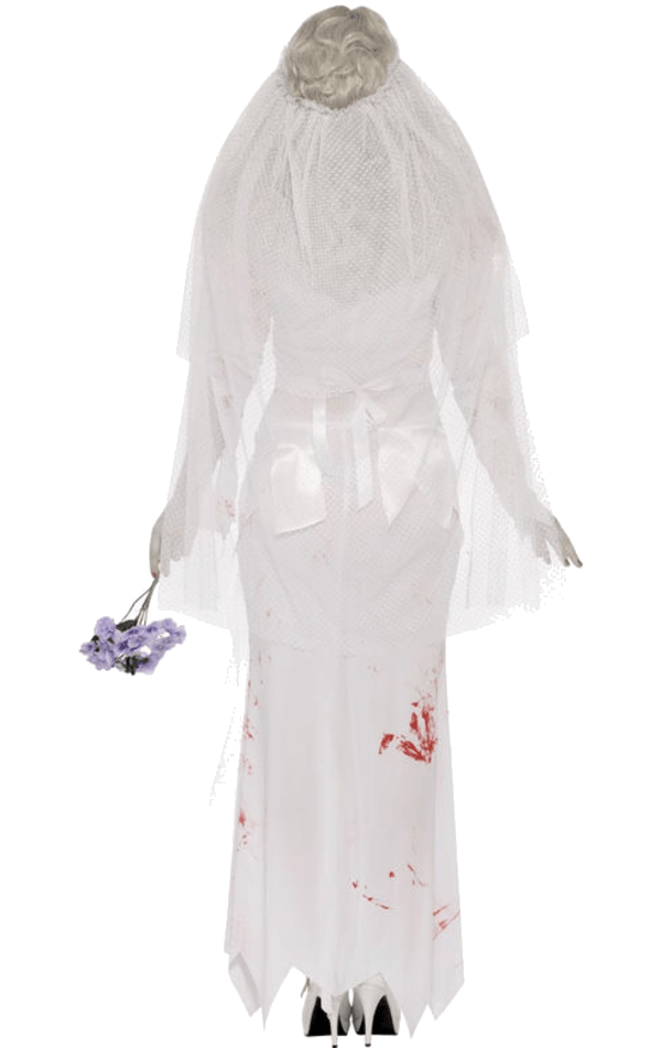 The Dead Bride Halloween Costume features a long, white dress with jagged edges. It also includes a netted veil to surprise your past lover when you say your vows, plus a bouquet of lilac flowers.