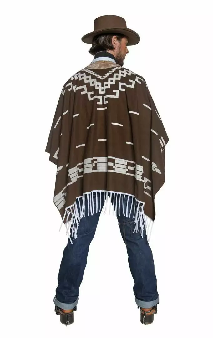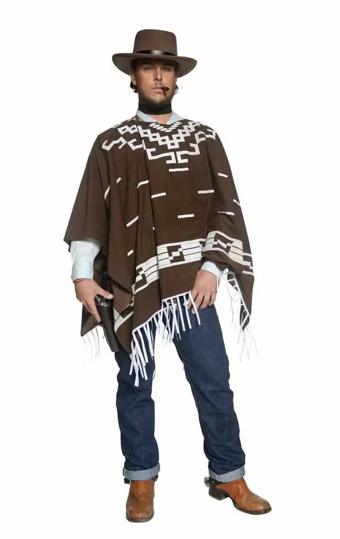 Western Cowboy Costume shirt with attached faux sheepskin waistcoat, fringed poncho and black neckband. A very Sergione Leone, Clint Eastwood style western costume, and iconic amongst film fans the world over. Jeans are not included.
