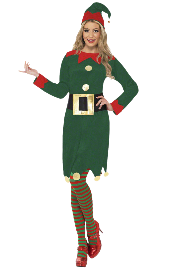 The ladies Classic Elf Costume is made up of a green dress with red cuffs and a collar. It features gold circle detailing for buttons and around the bottom of the skirt, to give you the glamourous elf look you desire. Completing your elf appearance is black and gold belt and a quirky elf hat.