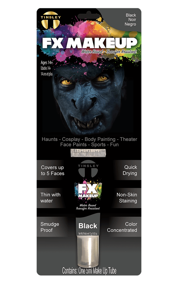 Black Makeup is a versatile face paint that should be in every face-painters kit! Perfect for deadly skull make up, Halloween horror make up and the outlining of all designs! This 5ml tube is water-based and non-staining. Suitable for ages 14+