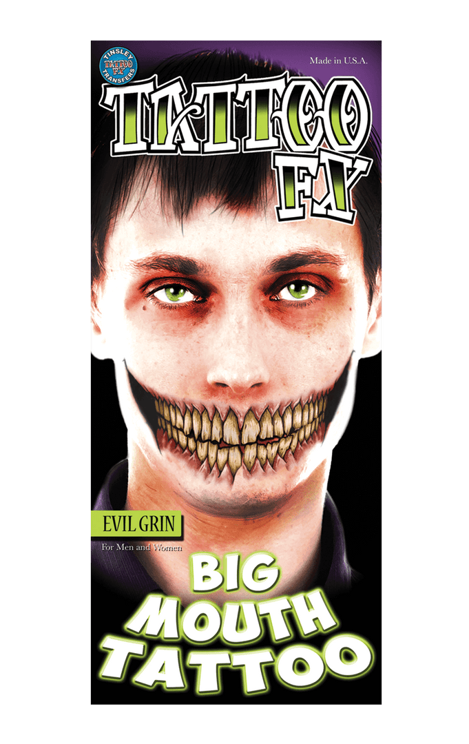 The Evil Grin Big Mouth Tattoo is perfect for those Horror clown teeth and evil skeletons!