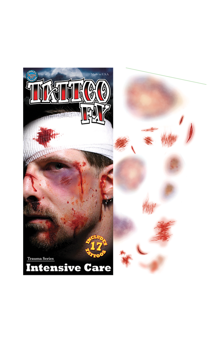 Going for an I’ve-just-been-beaten-up-so-give-me-some-sympathy look? Rock the fresh out of hospital sympathy vote with these realistic looking Intensive Care Temporary Tattoos this Halloween and get everyone asking the questions who, why, where, when…