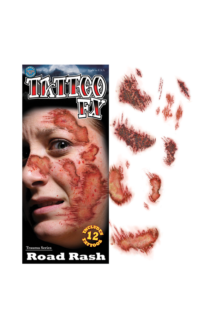 Want to look like a motorbiker who came off his bike in a death defying stunt? Or a zombie who was dragged behind a car as they attacked it? Makeup your characters story this Halloween and get the Road Rash Temporary Tattoos ready, they are gruesome, realistic and a graze above the rest!