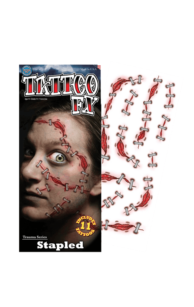 The Stapled Trauma Tattoo Accessory is perfect for adding some realistic stapled wounds to your face and body this Halloween!