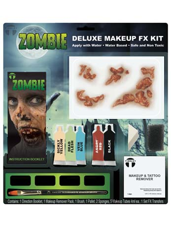 Now it’s super easy to transform into a brain-hungry zombie with the Zombie 3D FX Makeup Kit! This Halloween special effects kit features some rotting flesh zombie wound transfers, five face paints in a variety of colours – to create that spooky rotted look – a mixing palette, a brush, two sponges and a makeup remover wipe. Along with all this, you also get a cool How-To booklet guide, which will give you instructions on how to create these fuss-free looks! Ideal for Halloween and zombie parties, it’s a great way to get all the products you need in one. Use water to stick the transfer in place, it’s that easy, no Latex involved!
